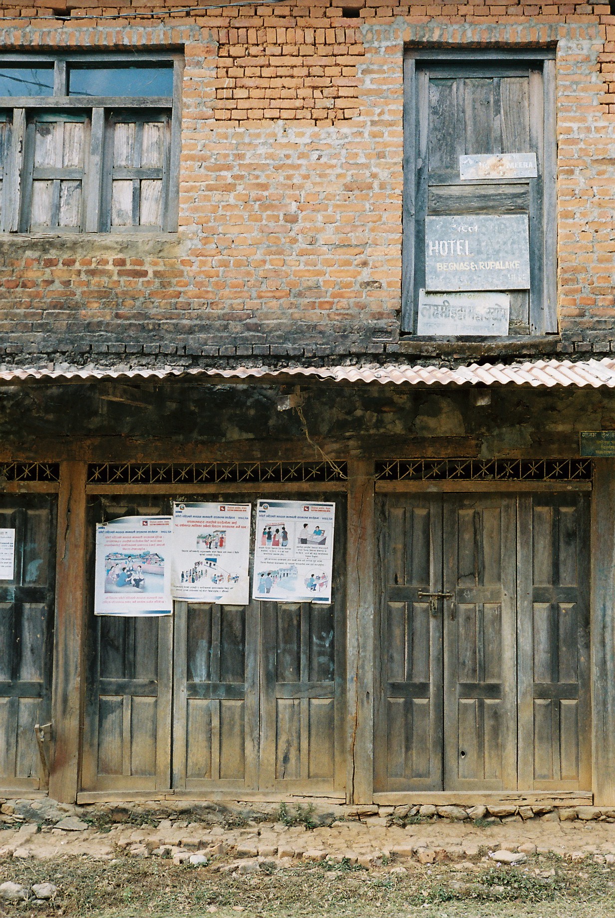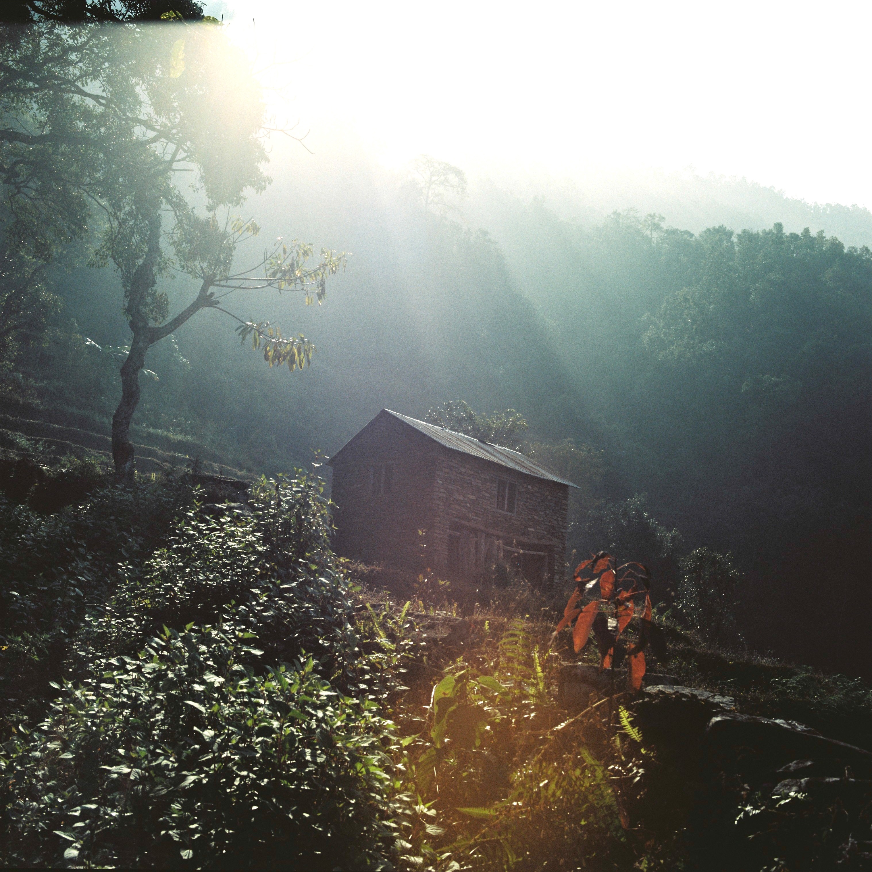 ここは一泊晩飯付きで250ルピー(280円程度)である。ゲストハウスと行っても現地の作りなので暖房器具なし壁は薄く隙間だらけなので部屋の中の気温はまったく外気と同じと言っても過言ではない。しかも与えられた寝具は掛け布団一枚。こんな寒い元旦の夜が未だ曽てあっただろうか。しかも布団は臭く、血が付着している。まーこんな山奥で寝るところがあるだけでもありがたいと思い2011年元旦初夜を迎える事になった。 左下は夕食の風景これだけ着込んでもめちゃめちゃ寒い。昼はTシャツでもOKだったのにこの寒暖の差はすごい。翌日は少し早く起きて朝日と山を見ようと思ったが霧がすごく山は少ししか見えなかった。準備が整い出発しようかと思っているとゲストハウスをきりもりしている若者の一人が実は学校で英語の先生をしているらしく、学校に遊びに来ないかと言われついていってみた。